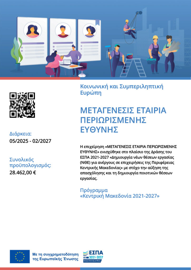 Η επιχείρηση «ΜΕΤΑΓΕΝΕΣΙΣ ΕΤΑΙΡΙΑ ΠΕΡΙΩΡΙΣΜΕΝΗΣ ΕΥΘΥΝΗΣ» ενισχύθηκε στο πλαίσιο της Δράσης «Δημιουργία νέων θέσεων εργασίας (ΝΘΕ) για ανέργους σε επιχειρήσεις της Περιφέρειας Κεντρικής Μακεδονίας» του Προγράμματος «Κεντρική Μακεδονία 2021-2027». Η δράση υλοποιείται με τη συγχρηματοδότηση της Ευρωπαϊκής Ένωσης και έχει ως στόχο την αύξηση της απασχόλησης και τη δημιουργία ποιοτικών θέσεων εργασίας. Ο προϋπολογισμός της πράξης ανέρχεται σε 28.462,00 € .